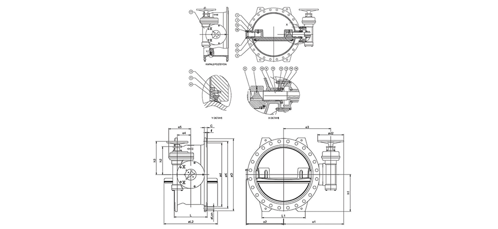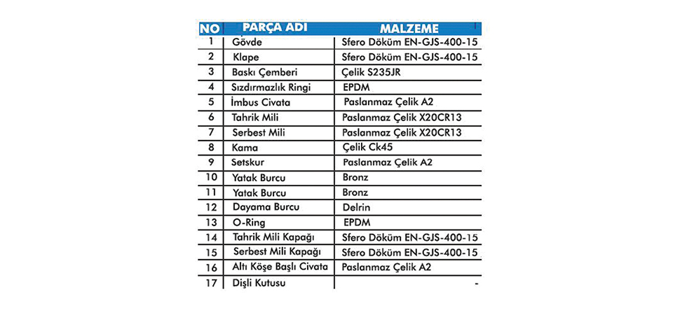 Vana gövde ve klapeleri minimum direnç gösterecek şekilde dizayn edilmiştir. Sızdırmazlık klape kenarında çevresel olarak baskı çemberi ile tespit edilen t kesitli sızdırmazlık ringi ile sağlanmaktadır. Klapenin kapalı pozisyonda sızdırmazlık ringi konik işlenmiş gövde sitine bastığından her iki yönde kesin sızdırmazlık sağlanır. Sızdırmazlık ringi klapenin sökülmesine gerek kalmadan kolayca değiştirilebilmektedir. Sit yüzeyi sert Krom veya AISI 316 paslanmaz çelik kaynak dolgu olarak imal edildiğinden sit yüzeyi aşınmaya ve korozyona dirençlidir. Kelebek vanalarımız çift eksantrik olarak imal edilmektedir. Birinci eksantriğin amacı vananın açılması sırasında kauçuk sızdırmazlık ringinin üzerindeki basıncın azaltılması, aşındırıcı etkinin ortadan kalkması ve sızdırmazlık ringi ile gövde siti arasında kesintisiz bir temasın elde edilmesi sağlanmaktadır. Vananın açılma işlemi sırasında kauçuk sızdırmazlık ringi gövde sit yüzeyinden ikinci eksantriğin yardımı ile kolaylıkla ayrılır. Vana içersinde geçiş kesitini artıran çift parçalı mil tasarımı bulunmaktadır. Mil sızdırmazlığı ise bronz ve delrinden imal edilen kendinden yağlamalı burçların üzerine yapılan O-ring sistemi ile vanaların bakım gerektirmeden daha uzun ömürlü olmasını sağlamaktadır. Dişli kutuları kelebek vanalar tarafından gerek duyulan çeyrek tur (90o) haraketi sağlar. Dişli kutuları kelebek vanaların tek taraftan etkiyen anma basıncı altında bir kişi tarafından el ile volanı çevirerek açılmasını sağlayacak şekilde dizayn edilmiştir. Kilitlenebilir tipte olup, akış koşullarından klape üzerine etkiyen kuvvetlerin klapeyi döndürmesine olanak vermez. Dişli kutusu çıkış flanşları her türlü elektrikli aktüatörün montajına uygun olarak imal edilmektedir. Dizayn: TS EN 593 uygun olarak üretilmektedir. Bağlantı boyu: TS EN 558-1 Flanş bağlantıları: EN 1092-2; ISO 7005-2